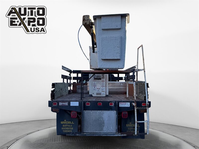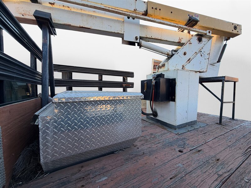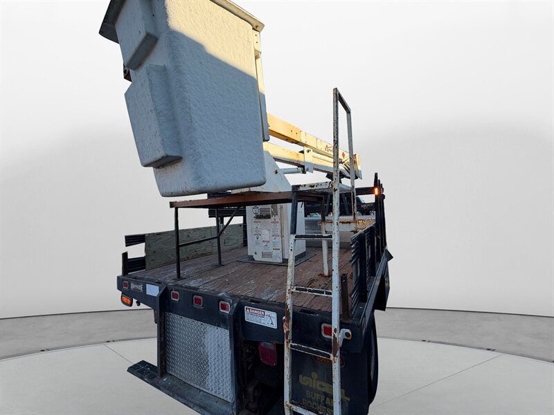 The bucket lift on this truck is designed for functionality and safety, with a reach that allows access to hard-to-reach areas. It features a hydraulic system that is easy to operate, making it suitable for various jobs, from tree trimming to electrical work.