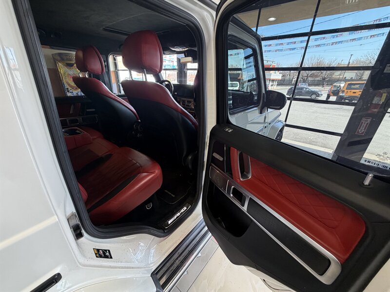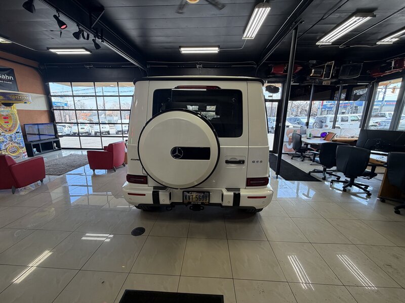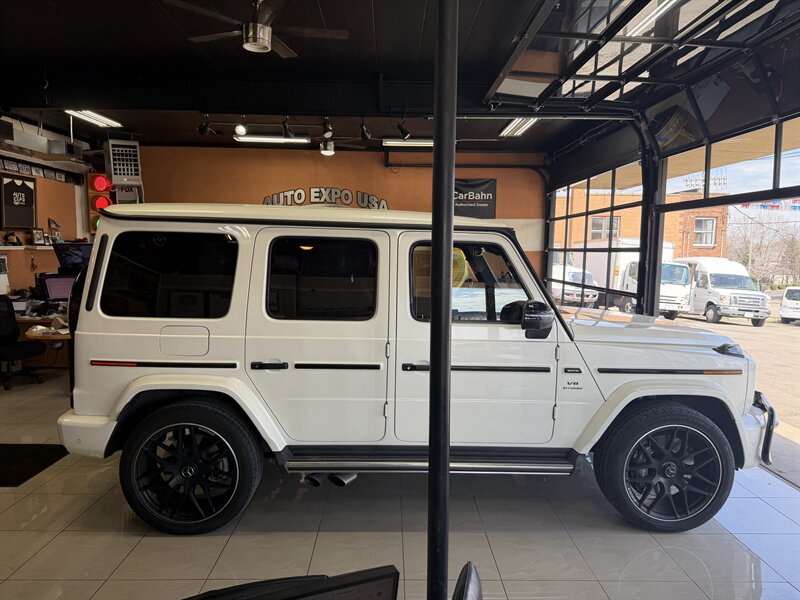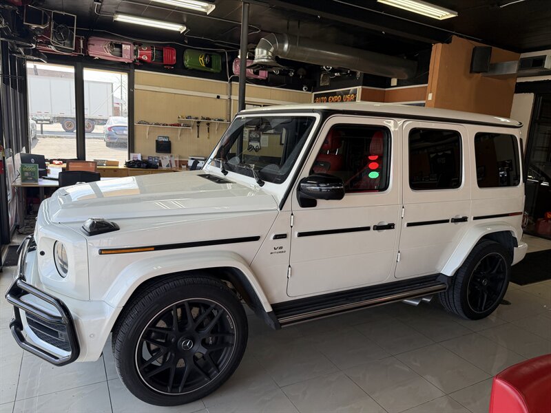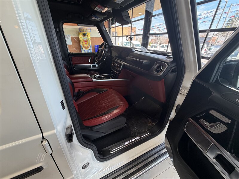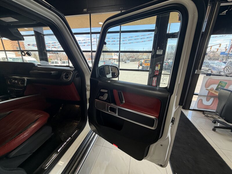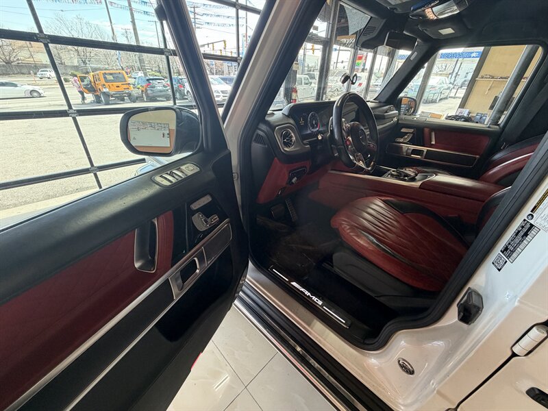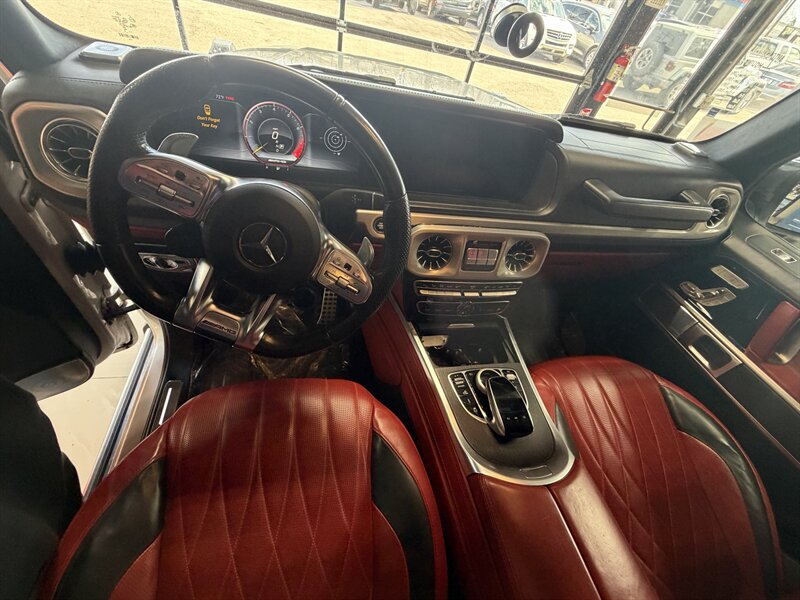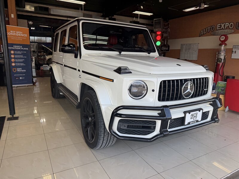2021 Mercedes-Benz AMG G 63 — designo Diamond White Metallic exterior with Classic Red/Black interior. Powered by the AMG 4.0L Twin-Turbo V8 producing 577 hp and 627 lb-ft of torque, mated to an AMG-tuned multi-speed automatic transmission and AMG performance drivetrain. This example shows below 54,000 miles (averaging under 9,000 miles per year) and is in excellent overall condition. EPA fuel economy is approximately 13 MPG city / 16 MPG highway.