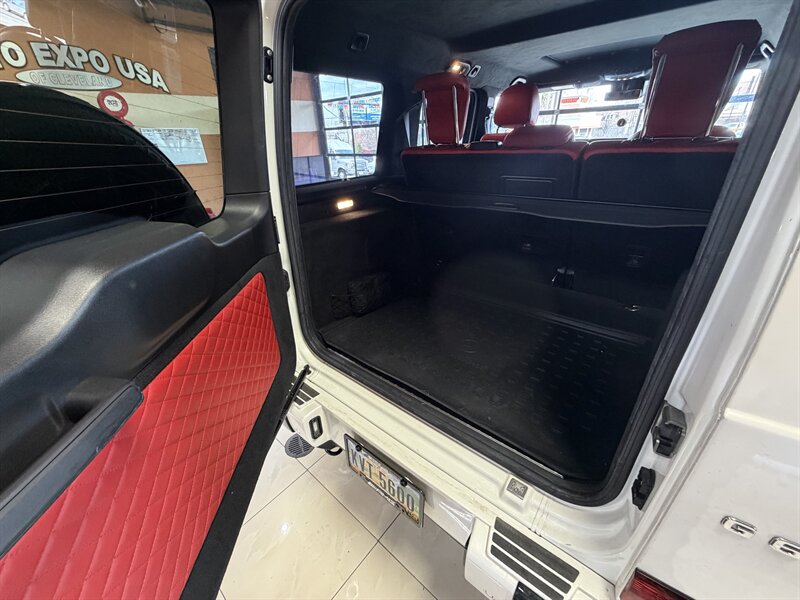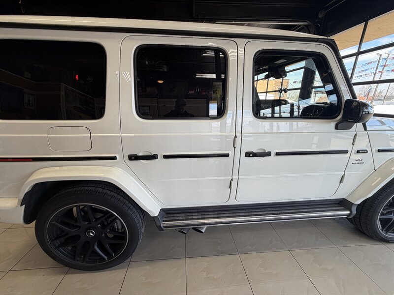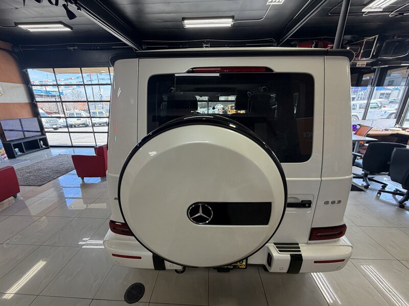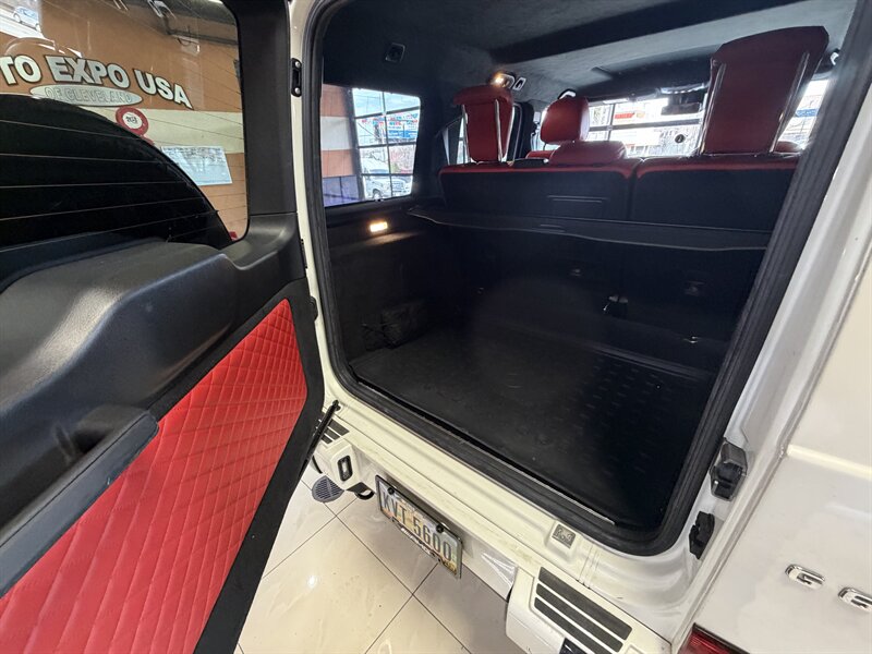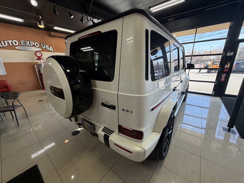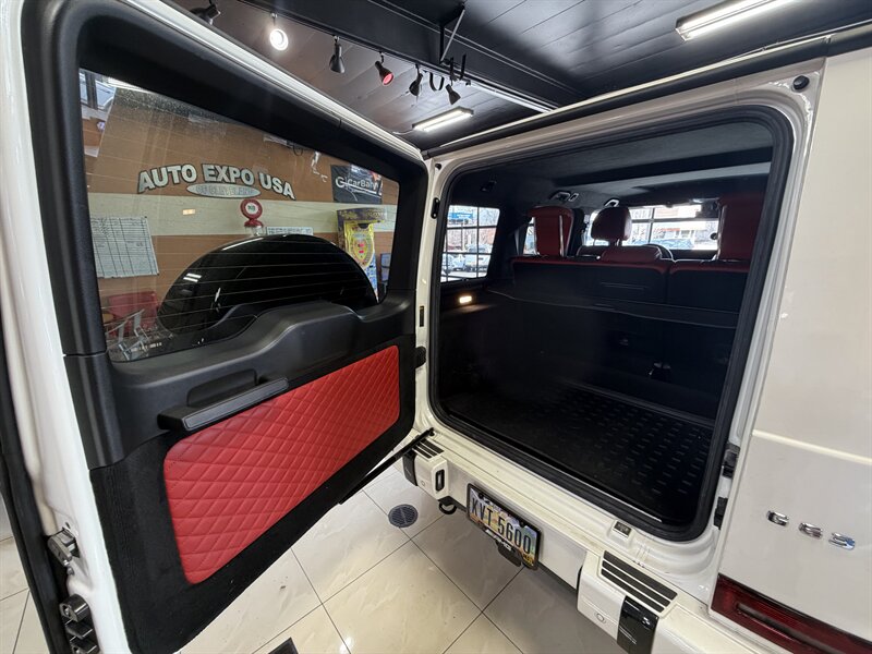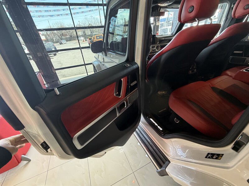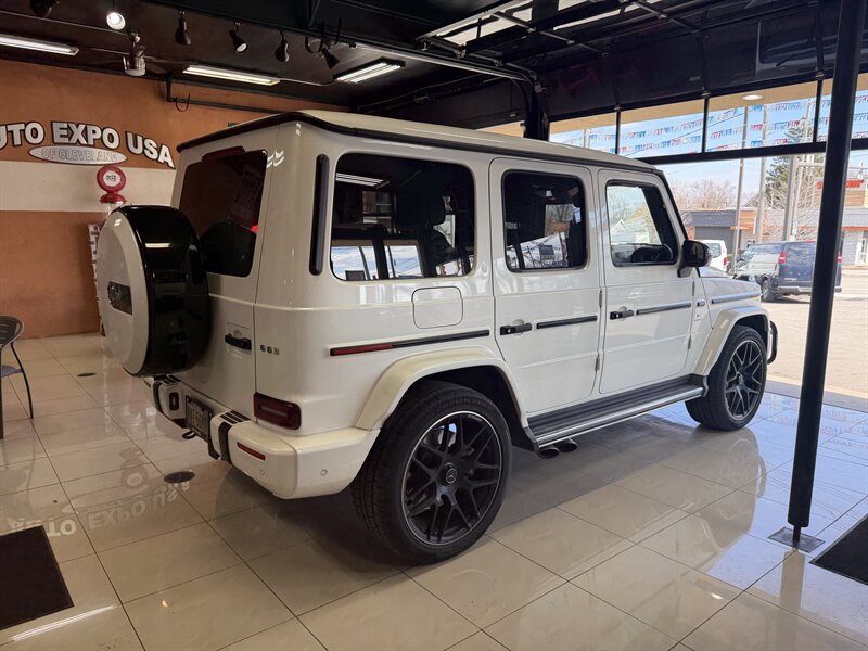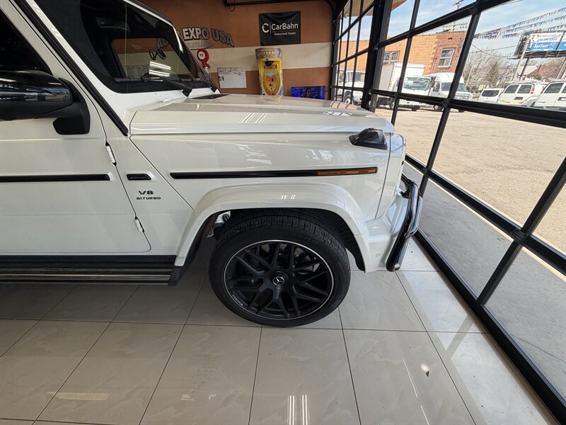 2021 Mercedes-Benz AMG G 63 — designo Diamond White Metallic exterior with Classic Red/Black interior. Powered by the AMG 4.0L Twin-Turbo V8 producing 577 hp and 627 lb-ft of torque, mated to an AMG-tuned multi-speed automatic transmission and AMG performance drivetrain. This example shows below 54,000 miles (averaging under 9,000 miles per year) and is in excellent overall condition. EPA fuel economy is approximately 13 MPG city / 16 MPG highway.